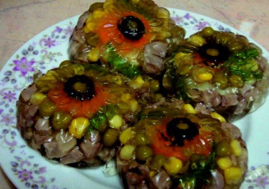 После извлечения холодцов из формочек или колец, верхушку каждого из них можно дополнительно украсить ломтиками маринованных огурцов, маслинами, консервированной кукурузой — в зависимости от того, какая идея воплощалась в декоре.