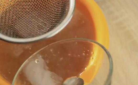 6. После того, как растворился желатин пропустите его через сито, для того, чтобы никакие посторонние кусочки не попались. Влейте его в бульон и размешайте. Затем возьмите половник и распределите жидкость по чашечкам.