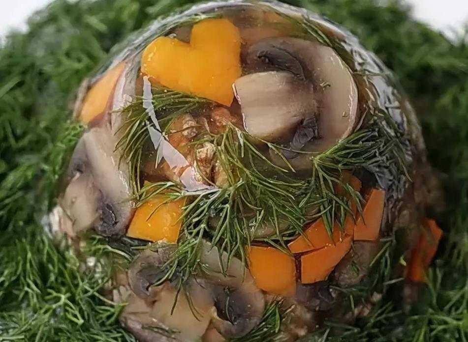 Природные мотивы под слоем прозрачного мясного или рыбного желе также радуют глаз едоков. Грибы и листики базилика способны создать настоящую осеннюю роспись на столе.