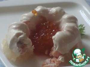 В полученную массу положить креветки, крабовое мясо и кусочки отварной красной рыбы (отварить 5-7 минут в рыбном бульоне).