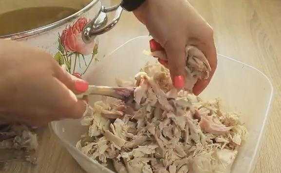 1. Заранее отварить куриное филе без кожи и приготовить бульон.