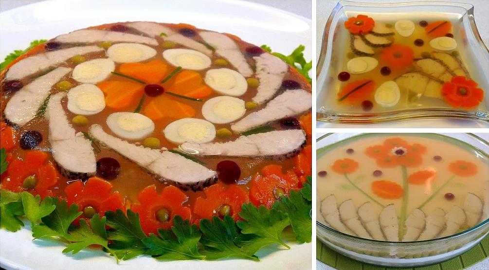 Эта холодная закуска из кусочков куриного мяса и овощей, залитая студенистым отваром, считается блюдом русской национальной кухни. Для создания прозрачной желейной массы, похожей на стекло используют желатин.
