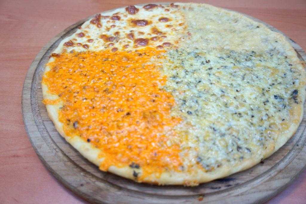 В пиццериях её обычно называют «Четыре сыра», указывая на количество ингредиентов. Но готовя такую пиццу дома, можно уменьшить количество ингредиентов даже до двух.