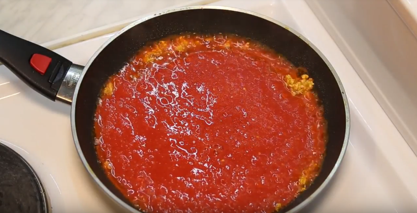 - Добавляются помидоры. Соус томится несколько минут. Если используются томаты в собственном соку, он тоже добавляется в соус.