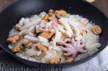 К луку добавляем предварительно подготовленные морепродукты. Я брала готовую смесь и перед использованием лишь разморозила ее. В моей смеси были мидии, кольца и щупальца кальмаров, креветки и маленькие осьминоги.
