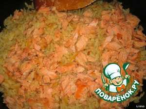 За несколько минут до готовности добавляем к рису форель, оставшееся (20 г) сливочное масло, аккуратно перемешиваем деревянной лопаточкой, солим по вкусу.