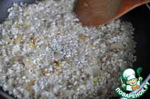 Добавляем рис «Арборио» от «Мистраль» и обжариваем на масле непрерывно помешивая.
