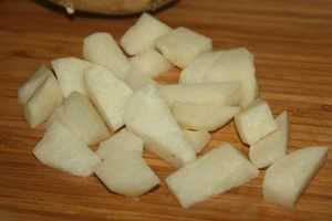 Картофель чистим от кожуры и промываем под холодной проточной водой. Разрезаем каждый клубнеплод на 4 – 8 частей и перекладываем нарезку в глубокую кастрюлю. Заливаем картофель водой так, чтобы она была выше его уровня на 5 – 6 сантиметров. Затем включаем плиту на средний огонь, ставим на нее кастрюлю с картофелем и варим овощ до полной готовности в течение 20 – 25 минут. Время варки зависит от сорта картофеля.