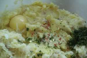 Вводим в рыбно-картофельную массу: пшеничную муку, измельченный укроп, куриные яйца без скорлупы, по вкусу соль, черный молотый перец и смесь специй для рыбных блюд. Перемешиваем все составляющие столовой ложкой до однородной консистенции.