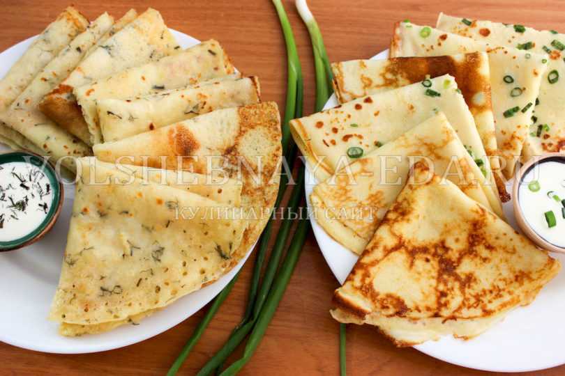 Чтобы придать блинчикам пикантный вкус, добавьте в тесто измельченный чеснок. Блинчики можно посыпать зеленым луком или укропом. Мелко нарежьте их и высыпайте прямо на тесто, налитое в сковороду.