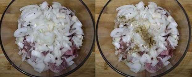 Чистим лук, но не отрезаем от луковиц носики и хвостики. Режем луковицы вдоль на четыре части (крест на крест). Если луковицы крупные – на 6 частей. 1-2 луковицы режем очень мелко, смешиваем с солью и «жмакаем». Эту смесь лука с солью вводим в мясо, перемешиваем, добавляем четвертинки лука – луковицы которые на верху нужно повернуть так, чтобы луковки лежали на мясе срезом вниз. Чтобы был контакт. При необходимости добавляем растительного масла – и кусочки мяса, и лук, — всё должно быть под плёнкой маринада и специй. Если сомневаетесь – налейте масла больше, потом отбросите на дуршлаг, чтобы стекли излишки масла.