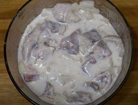 Если же для маринада используется кефир, продолжительность маринования увеличивается до шести часов. Одна мелко порезанная луковица смешивается с молотым перцем и солью. Мясо засыпается этой смесью и полностью заливается кефиром.