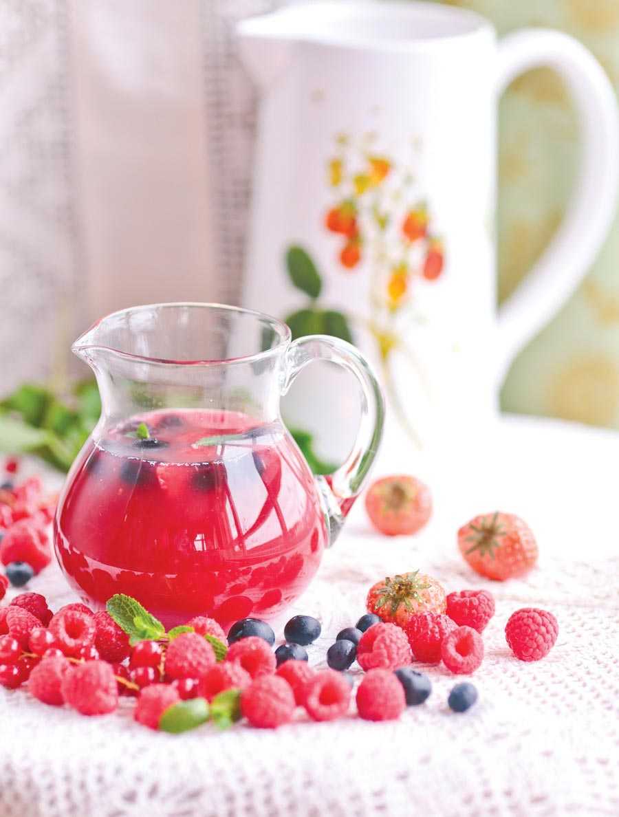 - Даем немного остыть и процеживаем. Переливаем в графин, добавляем по вкусу свежие ягоды малины, клубники, черники и листья свежей мяты.