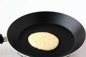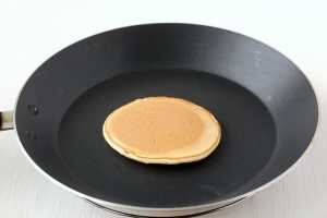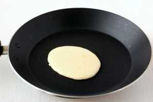 Для приготовления блинчиков понадобится сковорода с антипригарным покрытием. Сковороду разогреть и снизить огонь до среднего. Снять сковороду с огня, поместить её на 1-2 секунды на мокрое полотенце или холодную подставку. На середину сквороды выложить полную столовую ложку теста и вернуть сковороду на огонь.