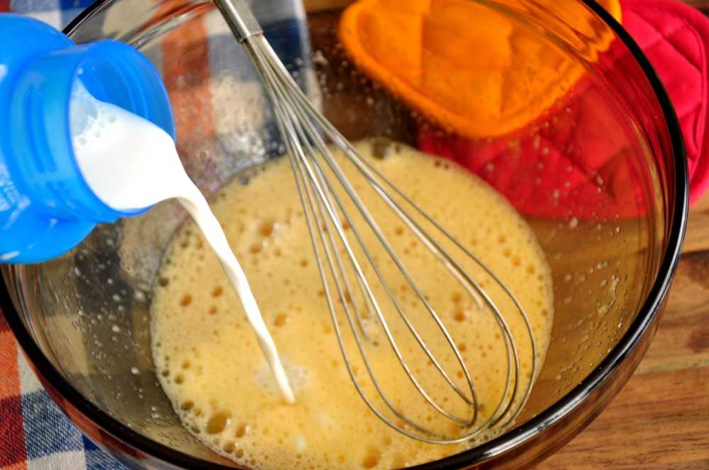 Яйца взбиваем венчиком до небольшой светлой пены и вливаем молоко.