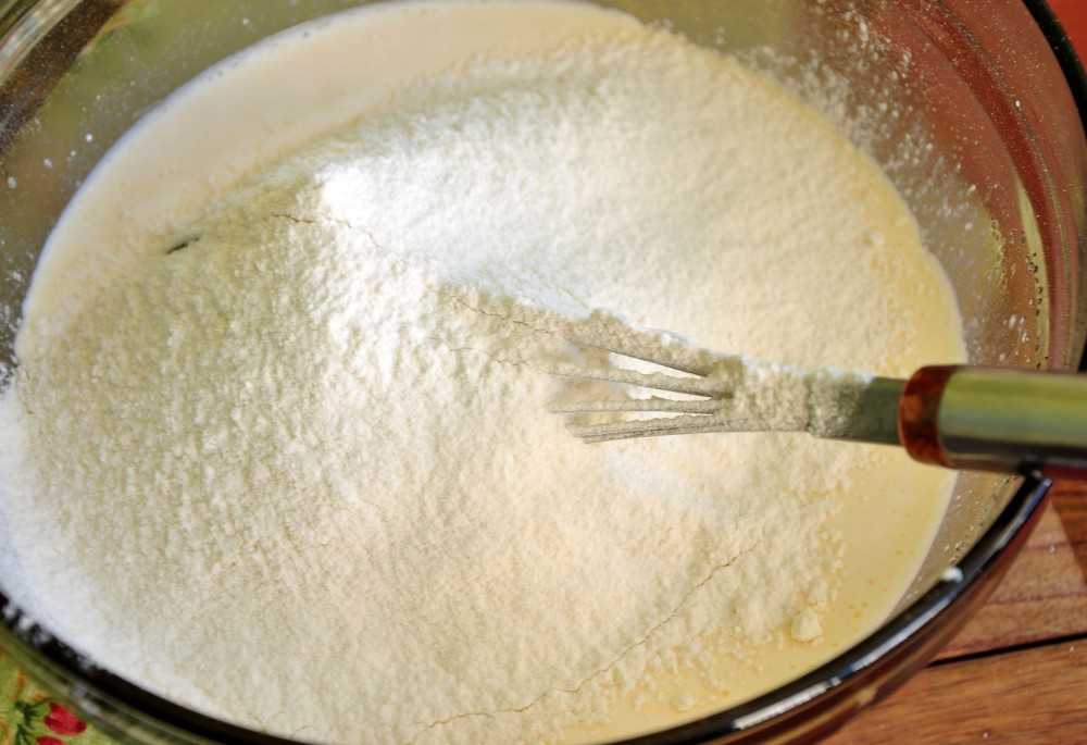 Вмешать муку с разрыхлителем до образования теста без комков.