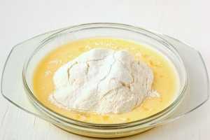Затем всыпьте муку с разрыхлителем и размешайте до получения однородной массы.