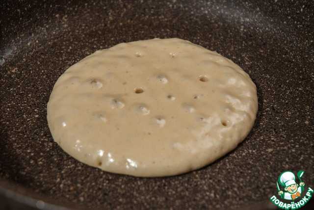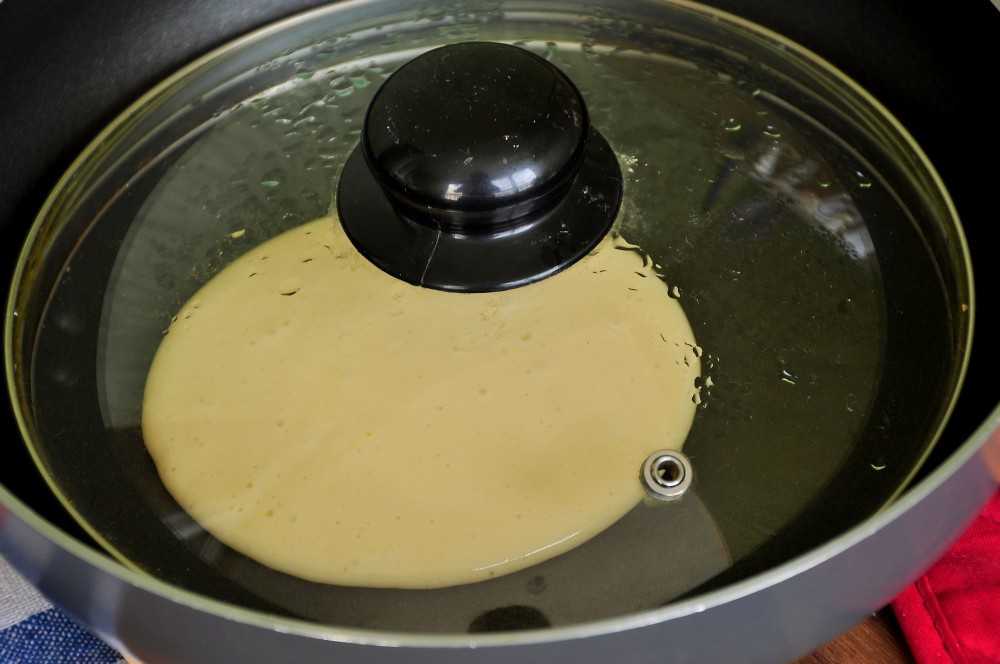 Накройте крышкой и поставьте на средний огонь. Когда блин начнет пузыриться – переверните.