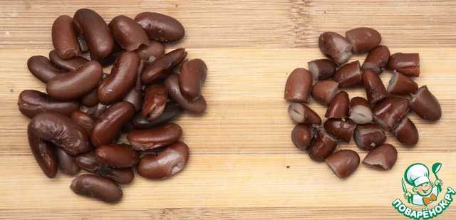 Японцы используют специальный сорт фасоли, но у нас её достаточно проблематично найти, поэтому я использую обычную красную фасоль. Она немного больше, чем японская фасоль, поэтому я разрезаю отваренные фасолинки пополам.