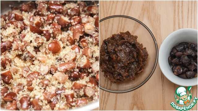 В измельчённую фасоль добавляем сахар, ванилин ждем пока сахар растворится и варим до загустения и карамелизации. Небольшую часть фасоли откладываем (если вы хотите, чтобы в пасте встречались кусочки фасоли), а оставшуюся перемалываем в блендере до однородной массы, затем соединяем её с отложенной фасолью. Этого количества пасты хватает на 2-3 сендвича.