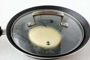 Сковороду разогреть, убавить огонь до среднего. На сухую, ничем не смазанную сковороду выливаем немного теста, у меня 2 ст.л. Наливаем каждую следующую ложку, в середину будущего блинчика. Сразу закрываем крышкой.