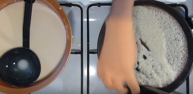 - Наливайте тесто на сковородку поварешкой, определяя количество его соответственно размеру сковородки, и равномерно тонким слоем распределяя его по всей поверхности.