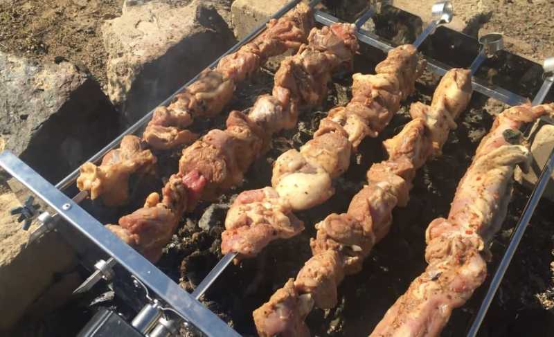 Выкладываем на мангал. Жарим шашлык около 20 минут, поворачивая его со стороны на сторону каждые 2 минуты.
