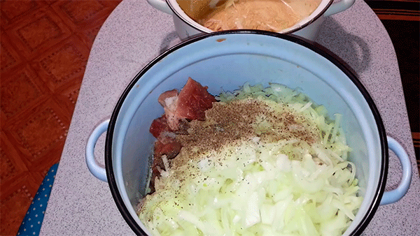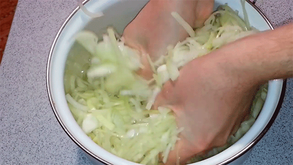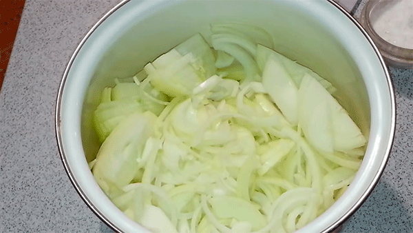 - Репчатый лук нарезать тонкими кольцами, посолить и размять руками, до выделения сока.