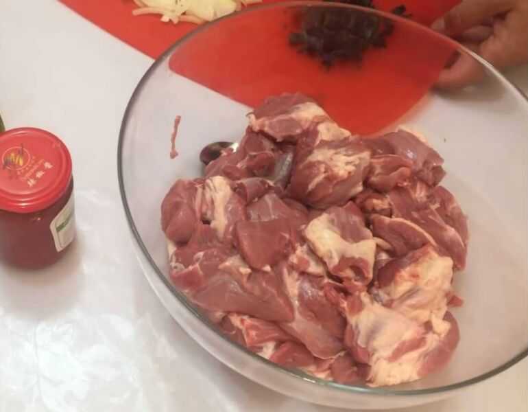 1. Нарезаем мясо на крупные куски так, чтобы в них была прослойка жира, который растопится при жарке. При желании несколько кусочков можно оставить с ребрышками.