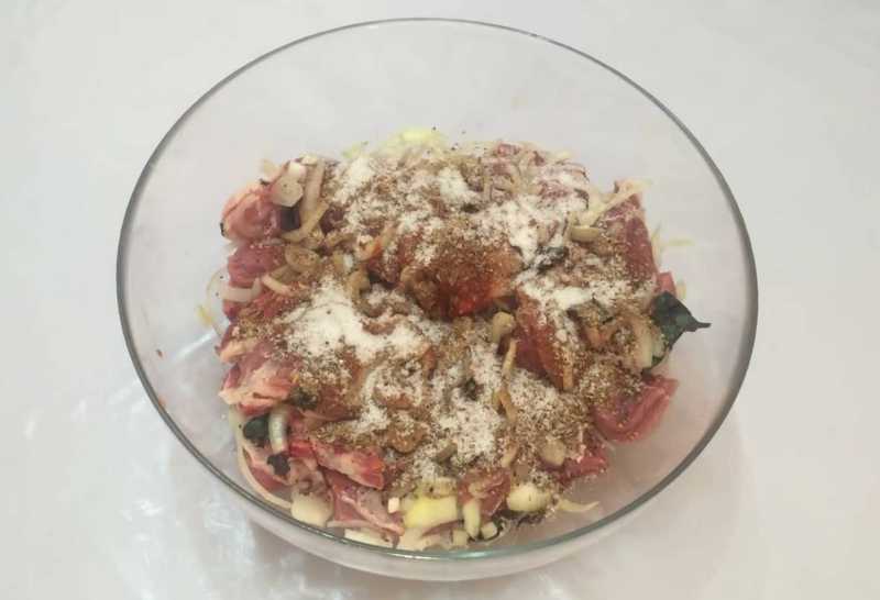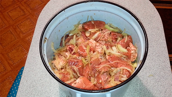 5. Перемешать мясо, чтобы каждый кусок был покрыт специями и луком. Оставить на ночь мариноваться при комнатной температуре.