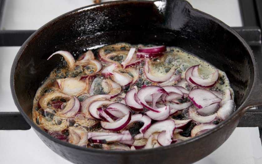 - Обжарить дольки луковицы в сливочном масле в течение 2 минут (можно добавить мелконарезанный чеснок).