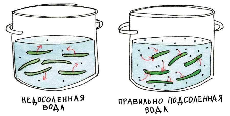 Представьте, что вы варите стручковую фасоль. Если вода несоленая или недостаточно соленая, концентрация в ней соли — минерала — будет ниже, чем концентрация минеральных веществ в фасоли. В попытке установить равновесие между внутренней и внешней средой фасоль будет терять часть минералов и природных сахаров в процессе кулинарной обработки и получится безвкусной, серой и менее питательной.