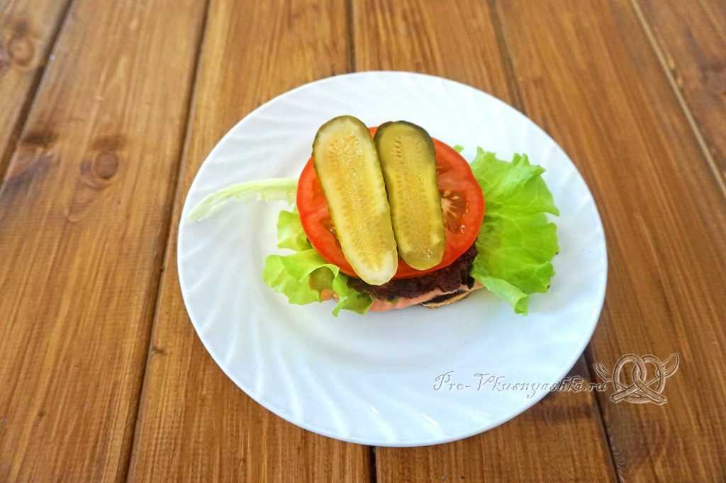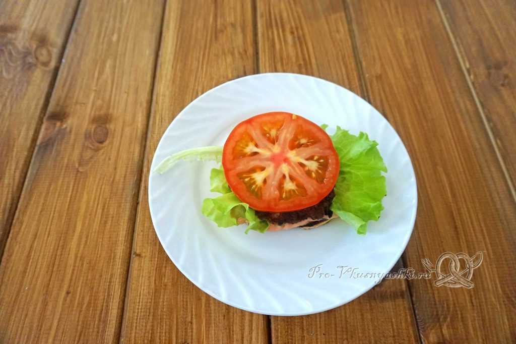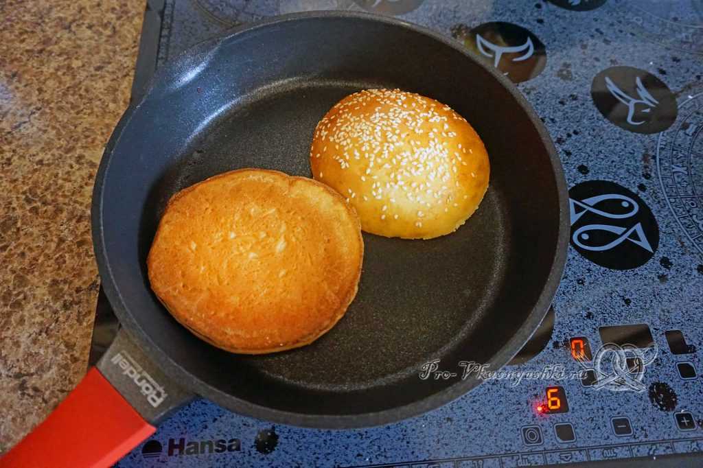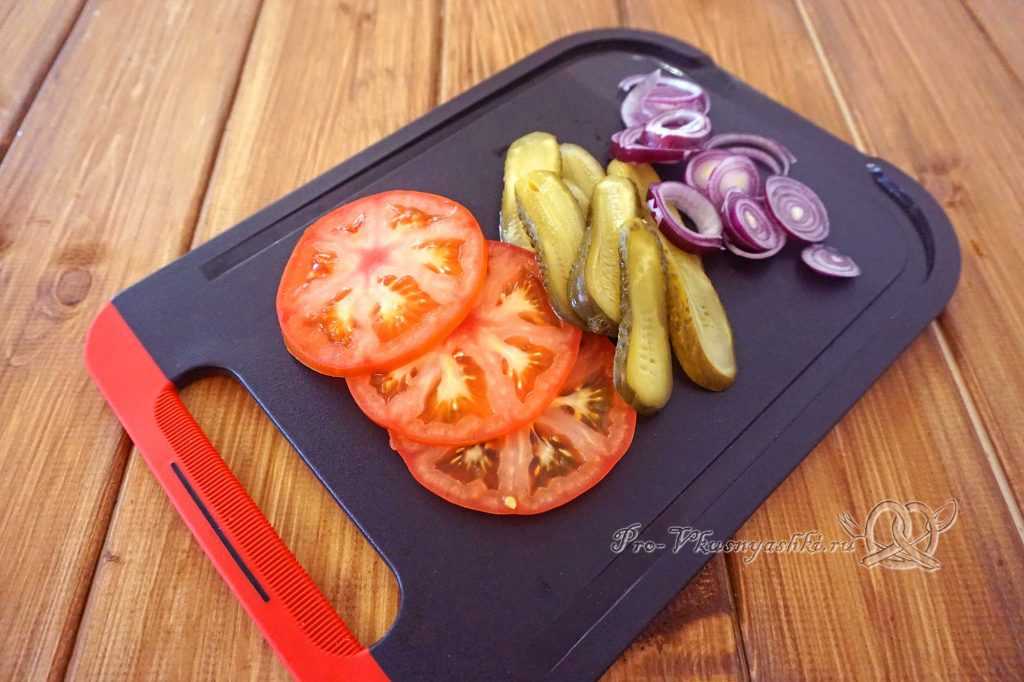 Котлеты жарятся быстро и подавать гамбургер лучше с тёплой котлетой, поэтому овощи для начинки лучше подготовить чуть раньше.