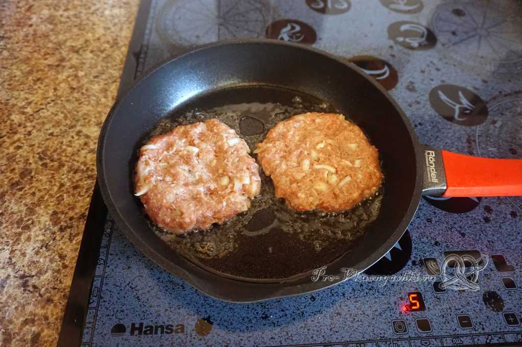 3. Полученную мясную массу разделите на шесть равных частей. Из каждой сформируйте круглую котлету и обжарьте. Полуфабрикат перед жаркой не панируйте.