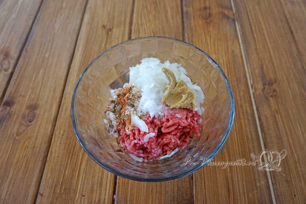 - Нарезанную поперёк волокон говядину пропустить несколько раз через крупную насадку мясорубки;