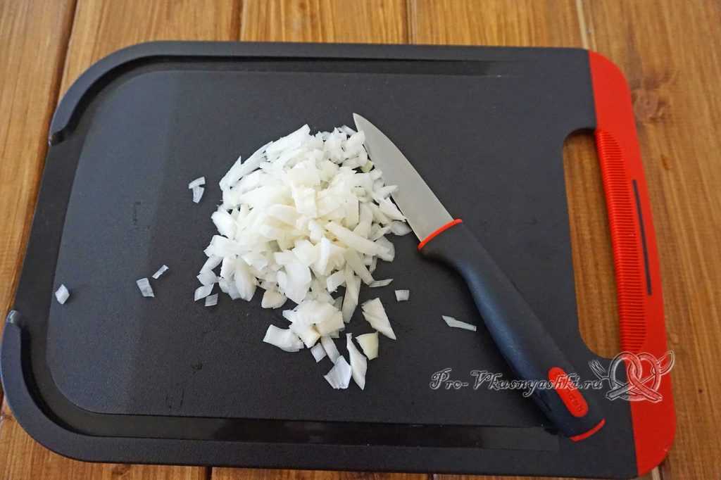 1. На подсолнечном масле спассеруйте мелко нарезанную луковицу до лёгкого золотистого цвета. Добавьте нашинкованный мелкой соломкой сладкий перец. Всё слегка прогрейте, а затем полностью охладите.