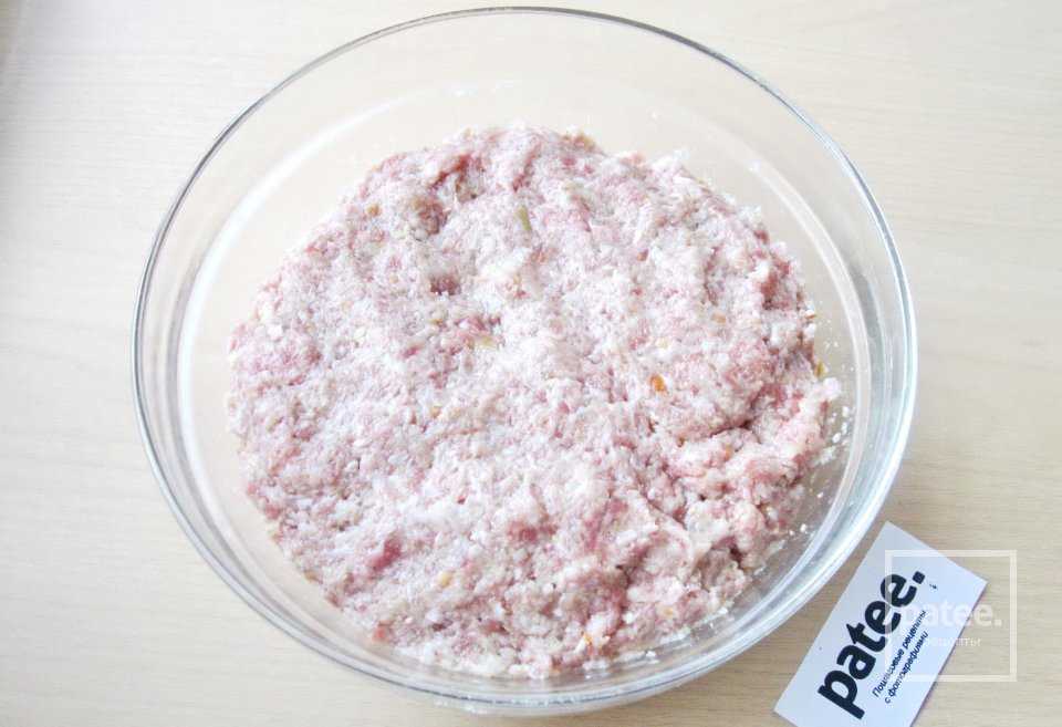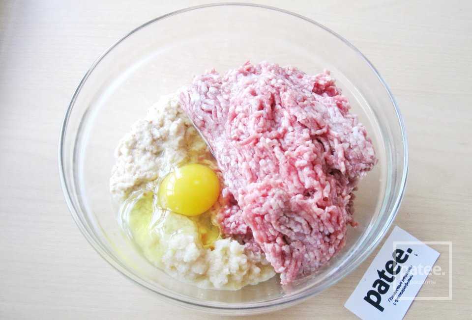 - Мякоть разбухшей булочки добавляем в фарш, также вводим взбитые яйца.