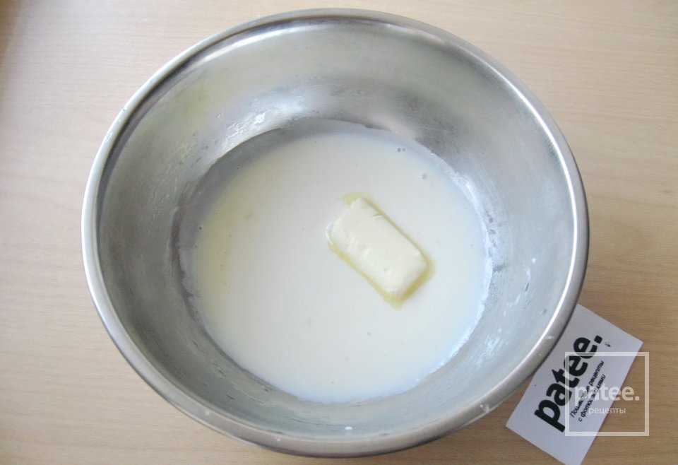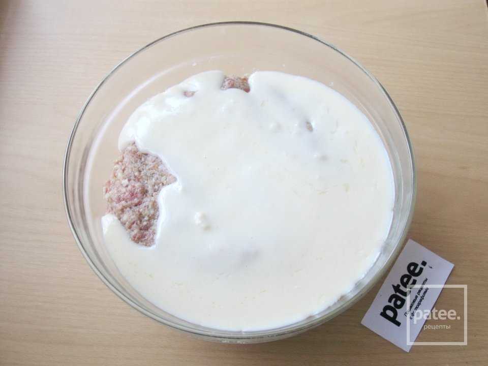 - В большой миске размещаем нарезанный на ломтики батон без корочки, заливаем молоком, держим 3-4 минуты. Хлеб должен полностью впитать жидкость.