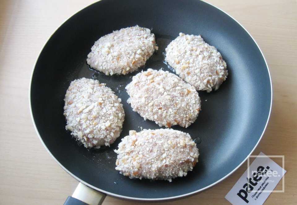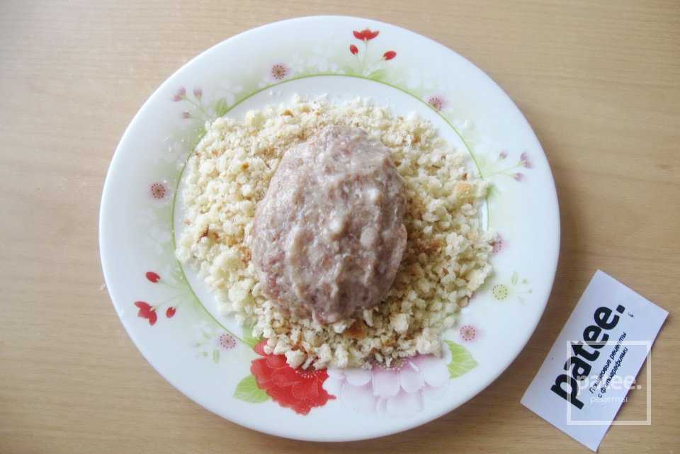 - Формируем шарики, слегка приплюскиваем, обваливаем в панировке, складываем на поверхность доски, посыпанной предварительно мукой.