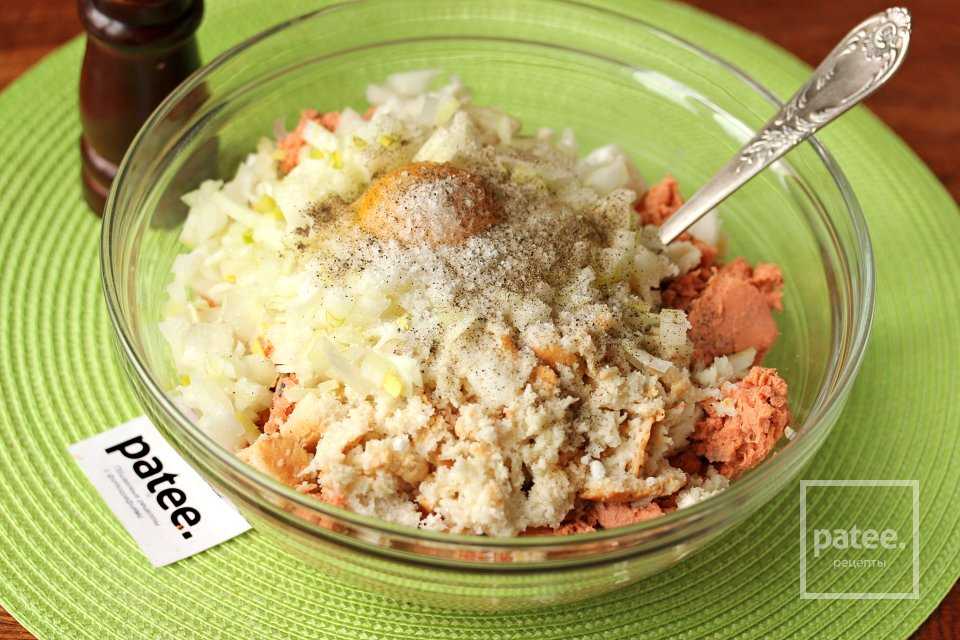 - Лососевый фарш выложите в подходящую по объёму миску, добавьте к нему отжатый вымоченный хлеб, измельчённый лук, несколько крупных куриных яиц и специи по вкусу. Тщательно перемешайте смесь.