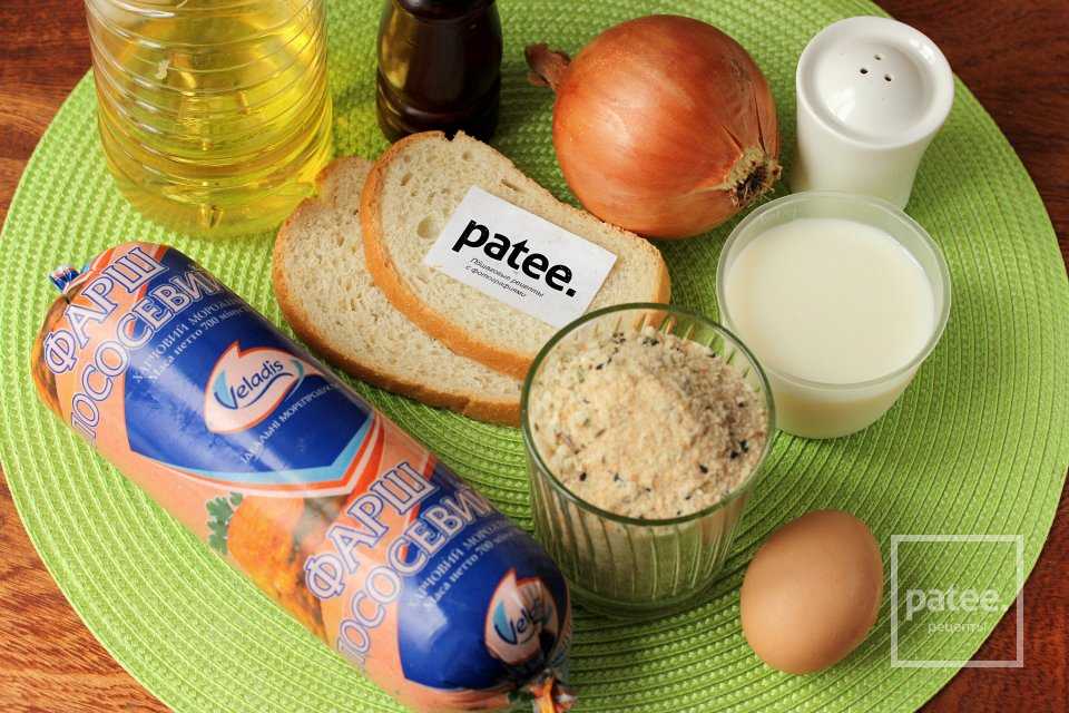 Для приготовления вкусных рыбных котлет нам понадобятся следующие ингредиенты: лососевый фарш, пшеничный хлеб, молоко, репчатый лук, панировочные сухари, куриное яйцо, масло подсолнечное рафинированное, вода, соль, чёрный молотый перец.