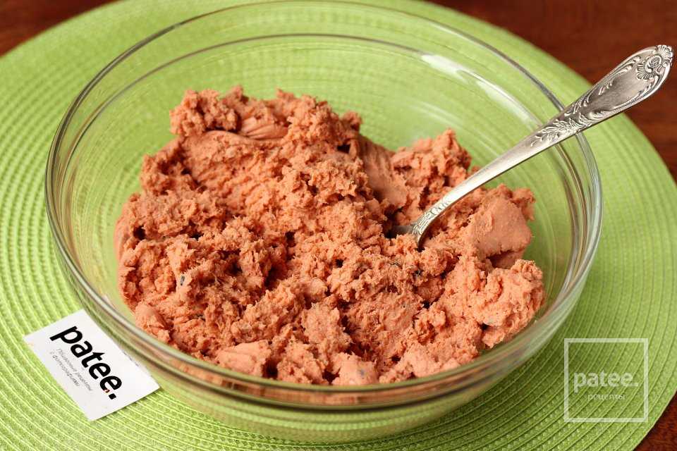 Готовый лососевый фарш перекладываем из тубы в миску и разминаем ложкой.