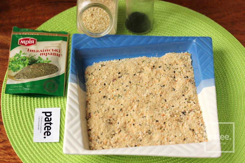 В качестве панировки я использовала домашние сухари с добавляем чёрного и белого кунжута, а также сухих трав. Но это вовсе не обязательно! При желании можно взять обычные панировочные сухари или кукурузную муку.