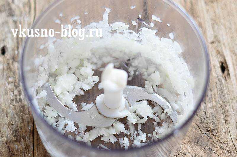 Луковицу среднего размера чистим, разрезаем на 4 части и мелко рубим в блендере. Все дальнейшие действия по приготовлению рыбного фарша для котлет мы также будет совершать в блендере. Это очень удобно и быстро. Если нет блендера – берем мясорубку или просто мелко рубим все ингредиенты ножом.