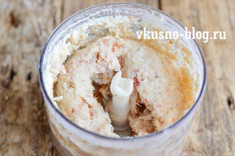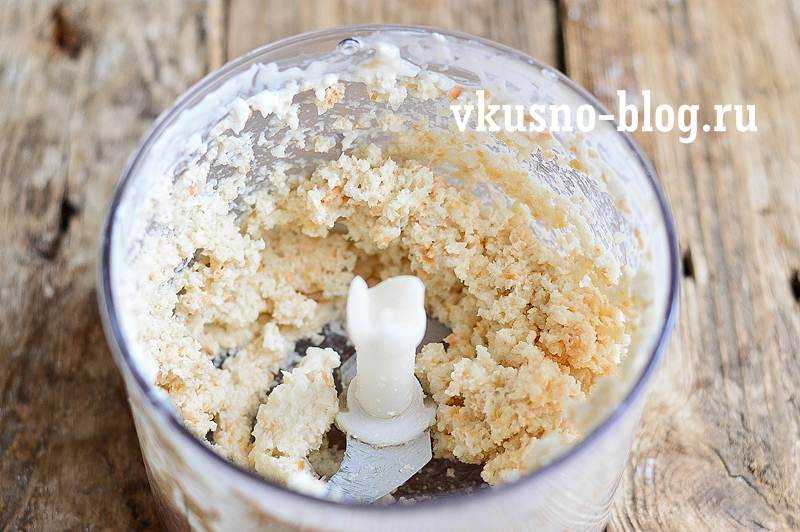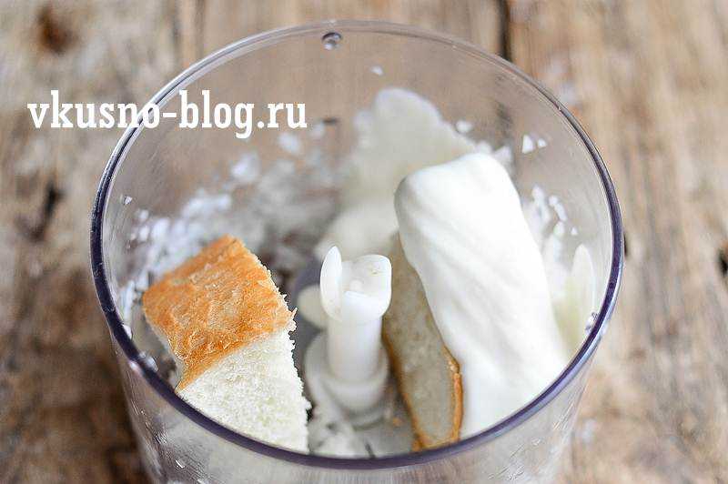 После того, как лук измельчили, добавляем в блендер два куска белого батона (предварительно размачивать не нужно). Также кладем в блендер 4 столовые ложки сметаны любой жирности. Снова все измельчаем.