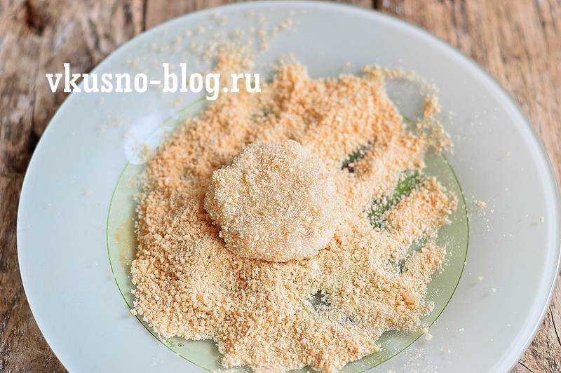 Насыпаем в тарелку половину стакана панировочных сухарей. Столовой ложкой набираем порции рыбного фарша из минтая (благодаря ложке порции фарша, а следовательно и котлеты, будут одинаковыми), смоченными в воде руками формируем из фарша шарик и обваливаем его в сухарях. Затем придаем шарику плоскую форму. Обычно котлеты имеют продолговатую форму, но мне захотелось приготовить небольшие круглые котлетки.