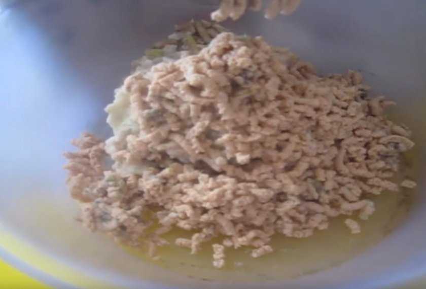 - В смесь вводится лук с маслом, в котором он поджаривался, все смешивается.