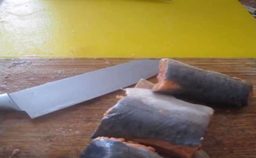 Горбушу промыть, обрезать ножницами плавники. Почистить. Промыть. Разрезать филе на кусочки для мясорубки. Если в рыбе были молоки – они тоже пойдут в фарш.