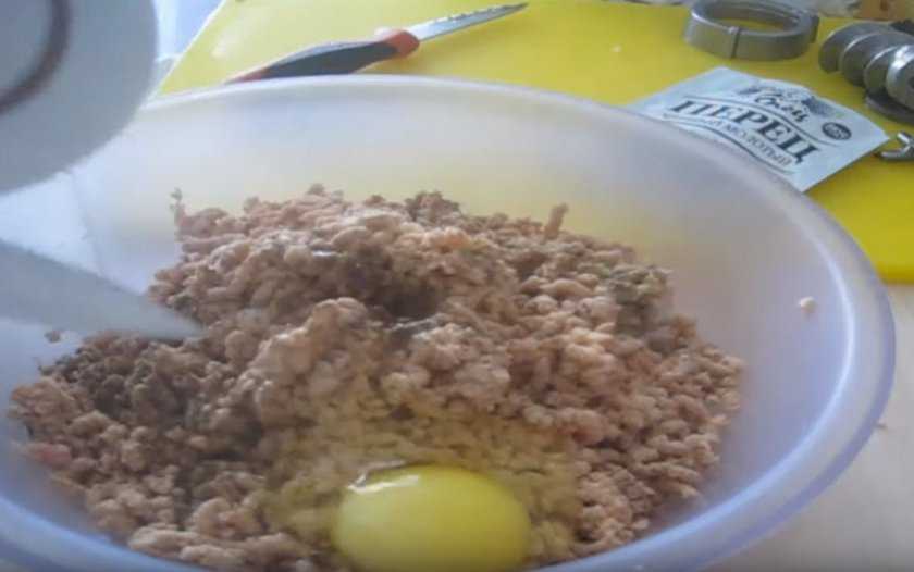 - Отправляем их в миску, смешиваем с измельченным луком, добавляем давленый чеснок, майонез, вбиваем яйцо и присыпаем все выбранными специями. Не забудьте про черный молотый перец.