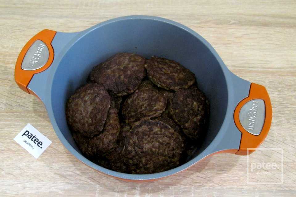 Таким образом обжариваем котлеты из всего печеночного фарша, складываем их в сотейник, вливаем кипяток и тушим под крышкой на медленном оне примерно 7 минут. Именно тушение сделает печеночные котлеты пышными и мягенькими.